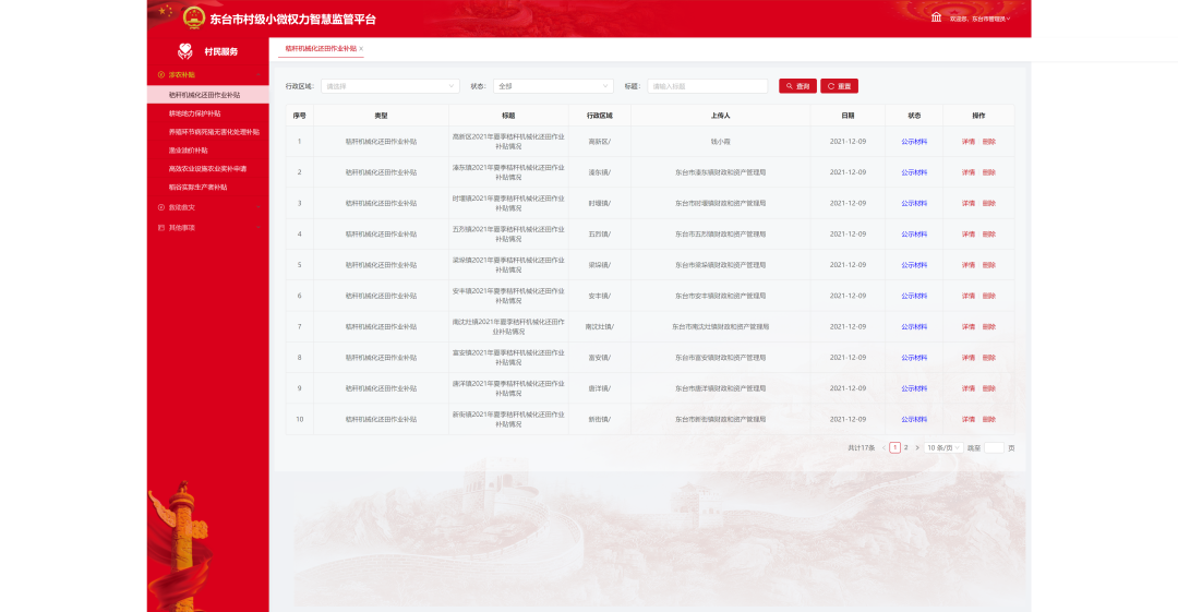 为巩固拓展村级小微权力清单制度,实现村级事务全过程监督,东台市建设了村级小微权力智慧监管平台。平台设置了重大决策、“三资”管理、用工管理、村民服务、阳光村务、OA审批、综合分析、监督管理八个模块。其中,“三资”管理、用工管理、阳光村务三个模块实现了与农村集体“三资管理+产权交易”综合信息管理服务平台、村级用工监管监察平台的数据共享。重大决策模块初步实现村级重大事项决策网上同步记录功能,OA审批模块将村级支出分为一般资金支出和大额资金支出两个类别进行网络审签。同时,村级小微权力智慧监管平台还开发了对应的手机App,并建立微信公众号,保证农民群众可以随时随地查阅自己关心的村级事务,推动村级小微权力在阳光下运行,推进乡村治理能力和治理水平进一步提升。截至2022年,平台已收集全市17个镇区、322个行政村村级事务重大决策、“三资管理”、涉农补贴、救助救灾、阳光村务等相关信息数据5336条。村务决策由“独角戏”变为“大合唱”,农村基层政治生态得到净化。