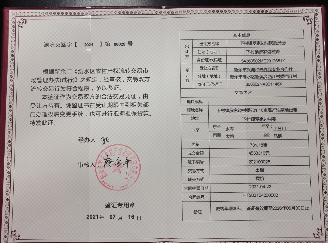 由渝水区农村产权交易中心出具的下村镇罗家边村委731.18亩高产油茶基地交易凭证