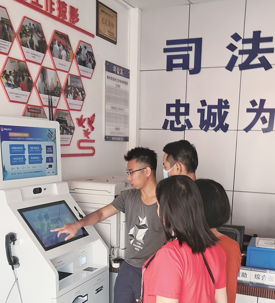 儋州市在市、镇两级公共法律服务机构投放16台公共法律服务终端机和1台“无人律所”。自助终端机充分结合人工智能、大数据和互联网的优势,全方位为群众提供法治宣传、人民调解、法律援助等智能导引和自助办理业务。同时,可以进行有关案例、法律法规文书等内容的查询、针对生活中常见疑难问题可以与在线律师通话进行远程咨询。儋州市中和司法所利用网络平台成功调解一宗跨越海南和北京两地,相隔3000公里的劳资纠纷,有效维护了农民工合法权益。