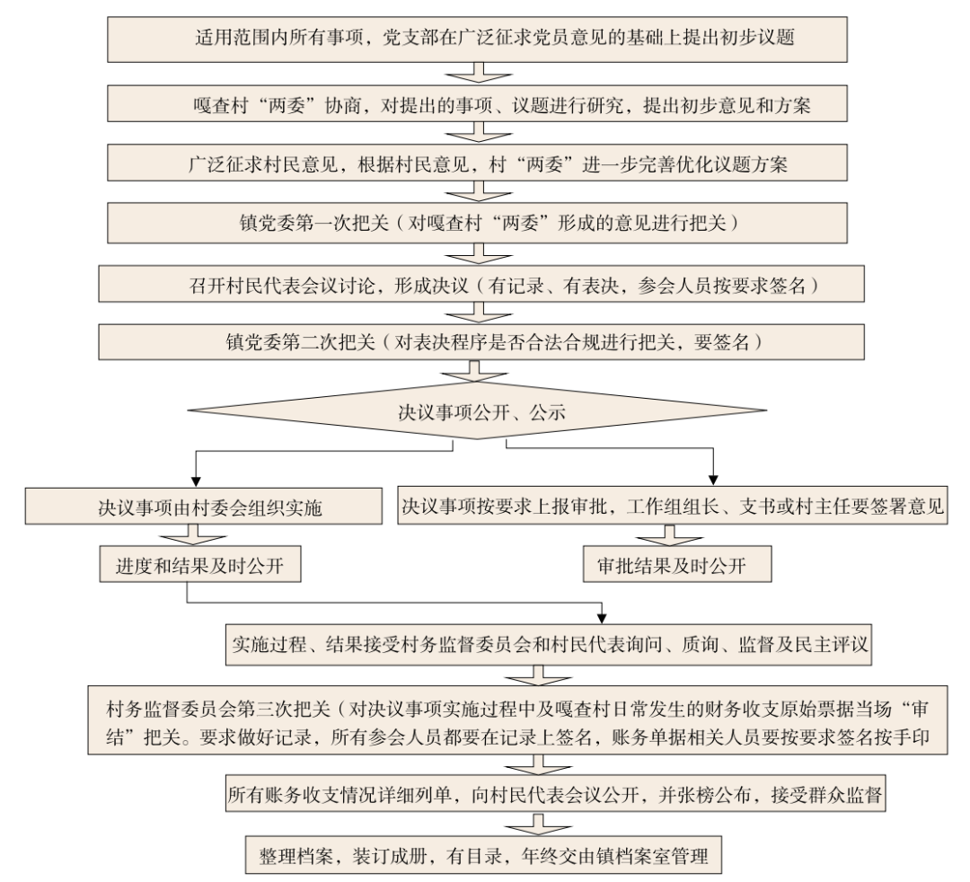 伊金霍洛旗在每个镇都成立民主决策领导小组,对村执行“四权四制”情况进行三次把关。一是对村“两委”商议形成的意见进行把关,重点看是否合法合规、是否切合实际、是否符合群众意愿。二是对村民代表会议审议表决程序进行把关,重点看程序是否合法,依据、定性是否准确恰当。三是对议定事项执行落实情况进行把关,定期组织召开现场“审结”会议,对决议事项实施中及村日常财务收支票据进行“审结”,并由村有关负责人现场解答,对合理收支进行核销入账,对不合理收支不予核销。